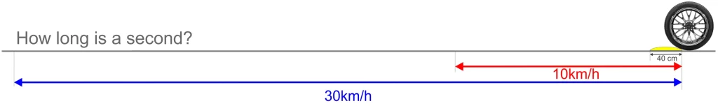 - At 30 km/h, a vehicle travels 8.33 m/sec.