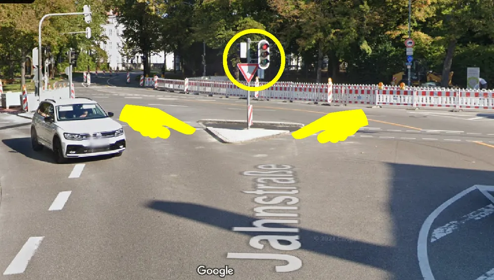 Von der Jahnstraße aus ist ein “Vorfahrt gewähren”-Schild zu sehen, das vom Ampel verdeckt/verschattet wird, und eine unmarkierte Insel. Bordsteine sind Hindernisse auf der Fahrbahn, und Hindernisse, selbst Inseln, sollten mit spezifischen Markierungen gekennzeichnet sein.