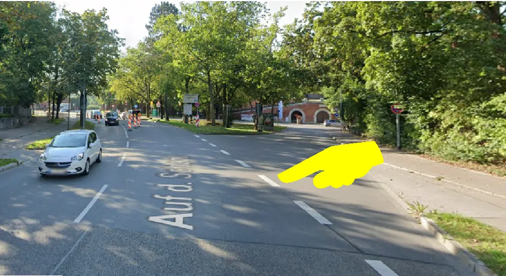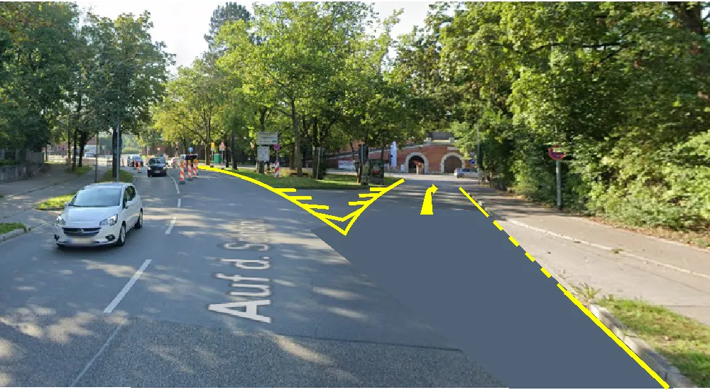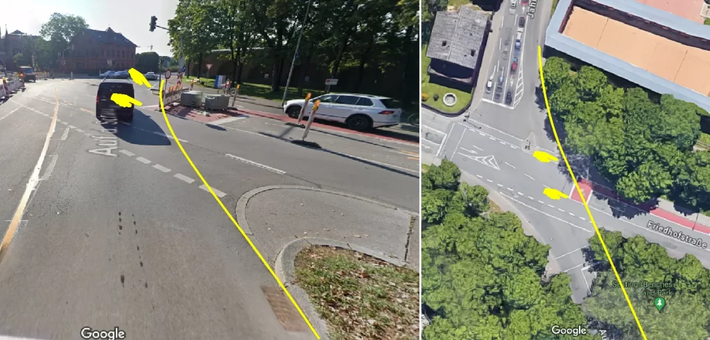Auf der Auf d. Schanz Straße sagt mir die Verkehrsbeschilderung und -markierung, dass ich den linken Weg an der Gabelung nehmen soll, da der rechte Weg durch die Leitlinie gesperrt ist. Auch wenn ich nach rechts in die Friedhofstraße abbiegen möchte, werde ich den linken Weg nehmen, da ich bei 50 km/h mit 13,89 m/s unterwegs bin und die Zeit zur Verarbeitung der Informationen zu kurz ist.