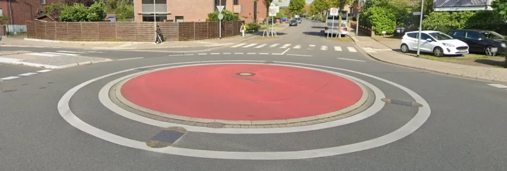 Die Gestaltung eines kleinen Kreisels bringt Herausforderungen für lange Fahrzeuge wie Lkw, Anhänger oder Busse mit sich. Daher empfehle ich, die Insel innerhalb des Kreisels aus Pflastersteinen oder farbigem Mischmaterial mit einem kleinen Höhenunterschied zu bauen, um den Verkehrsknotenpunkt auch für diese Fahrzeuge passierbar zu machen. Auf diese Weise kann im Fall, dass ein langes Fahrzeug seine Spur nicht halten kann, das Heck des Fahrzeugs oder besser gesagt die Hinterräder auf die Insel auffahren, ohne Schäden zu verursachen.