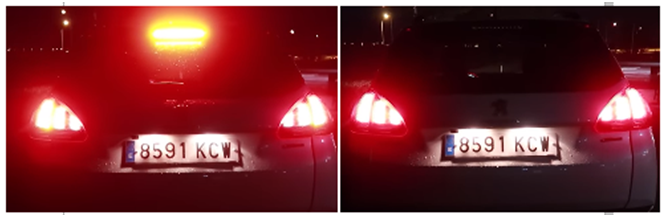 This video captures the difference between the tail light and the brake light much more clearly, because the camera lens increases the light contrast. In reality, the human eye perceives contrast differently, the contrast being much lower and the risk of accident much higher.